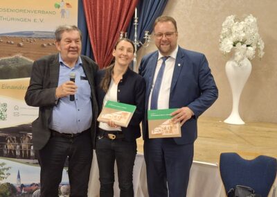 Präsident Schmidt und Vizepräsiden Seifert übergeben Frau Roswora das Buch zur Geschichte der Thüringer Landwirtschaft