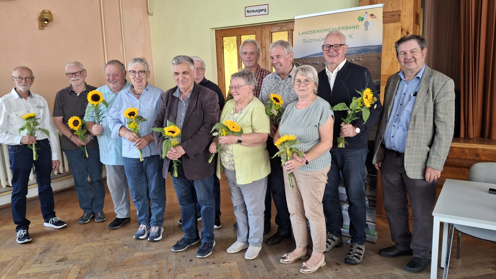 (08.08.2025) Der Saal in Reurieth war gut gefüllt, als der Landseniorenverband Südthüringen e.V. zu seiner diesjährigen Mitgliederversammlung eingeladen hatte. Auch die Gäste, Peggy Greiser, Landrätin Schmalkalden-Meiningen, Dirk Lindner, 1. Beigeordneter Landkreis Hildburghausen, Gerold Schmidt, Präsident des Landseniorenverbandes Thüringen e.V. und TBV-Vizepräsident Toralf Müller folgten aufmerksam dem Rechenschaftsbericht des Vorsitzenden, Albert Seifert. Seifert berichtete über die Arbeit des vergangenen Jahres und informierte, wie der Vorstand die Belange der Senioren zum Mittelpunkt seiner Arbeit gemacht hat. Er legte auch den Standpunkt des Vorstandes zur Situation in der Landwirtschaft und zu den Problemen in den Dörfern dar. Durch die gute Zusammenarbeit mit dem Seniorenbeirat Hildburghausen und dem Landesverband der Landsenioren wurden Probleme, die die Seniorinnen und Senioren beschäftigen, an die Politik und die zuständigen Behörden herangetragen. Beispielsweise standen Themen, wie der Ausbau der Windkraft, die Heizungsumstellung, gesundheitliche Versorgung, häusliche Pflege, Mobilität im ländlichen Raum, die Grundsteuerreform oder Fragen der Waldbewirtschaftung auf der Tagesordnung.