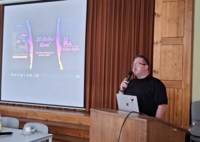 Als letzter Tagesordnungspunkt referierte Ingo Weidig, Direktor des Hennebergischen Museums Kloster Veßra, unter der Überschrift „20 Malter Korn“ zu den Ereignissen während des Bauernkrieges in der Region. Er wies auch nach, dass die Haufen der Aufständischen nicht nur aus Bauern bestanden und dass sowohl der Bildhäuser Haufen als auch der Werra-Haufen vorrangig Forderungen nach mehr Freiheit und Selbstbestimmung in kommunalen und religiösen Angelegenheiten stellten. Viele Anwesende zogen Vergleiche zu den Forderungen, die heute von den Landwirten gestellt werden. Der Historiker erläuterte die Rolle der Klöster in dieser Zeit und erinnerte auch an die Schlacht bei Meiningen, bei der es auf jeder Seite 9 Tote gab. Weidig lud die Seniorinnen und Senioren ein, die sehenswerte Ausstellung „1525 – Bauernkrieg im Henneberger Land“ im Museum Kloster Veßra zu besuchen. WH